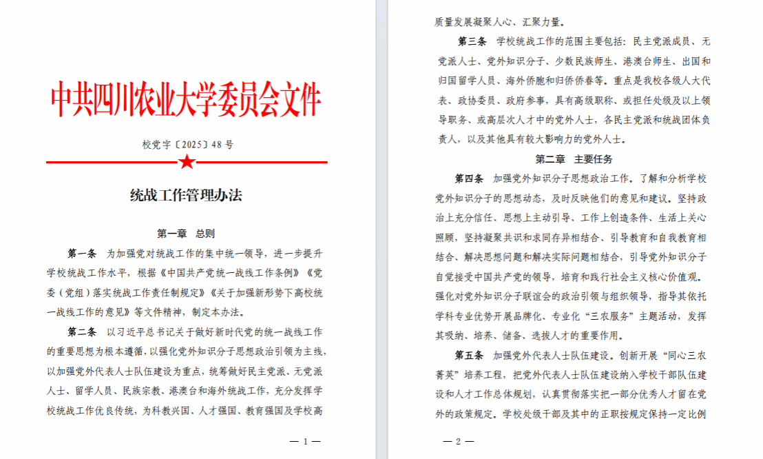 民革中央副主席、四川省政协副主席、民革四川省委会主委欧阳泽华莅临学校调研指导,学校与民革四川省委正式签署《助力四川农业强省建设合作协议》,在科技攻关、成果转化、智库共建、人才培养等领域构建长效合作机制。学校主要领导率先垂范,2次亲赴省委和雅安市委统战部交流洽谈,持续深化与重庆、成都、遂宁等地联动合作,推动统战工作与中心工作深度融合。