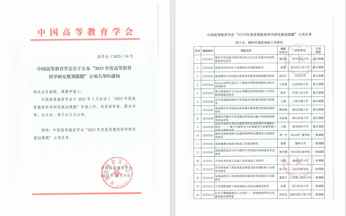 面向京津冀、长三角等13个省份的30所高校,开展360名留学归国教师专项调研,形成的研究论文成功入选全国农林水高校统战工作论坛论文集,荣获全省统战理论政策创新研究成果,并被CSSCI期刊《思想政治教育研究》接收。1项统战课题再次获中国高等教育学会立项资助,标志着我校统战工作正逐步从事务型向研究型延伸,为新时代高校统战工作高质量发展探索新路径、提供新支撑。