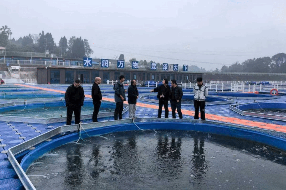随后,曹全全在刘华陪同下,实地走访水霖渔业(大英)有限公司、大英县黄颡鱼生态养殖基地,深入鱼池、车间及苗种区,全面了解苗种繁育、养殖密度、水质管理、饲料投喂、病害防控等情况。针对养殖中存在的水质波动、抗病力提升、规模化示范建设等难题,他提出科学技术思路,并建议在良种选育、生态健康养殖体系建设等方面深化校地技术攻关。调研中,曹全全重点关注大英县独有卤水资源,指出其稳定的水质与适中的矿化度,为“海鲜陆养”提供了天然优势,建议结合科学调控,探索以南美白对虾为基础的多盐适性品种养殖路径。
