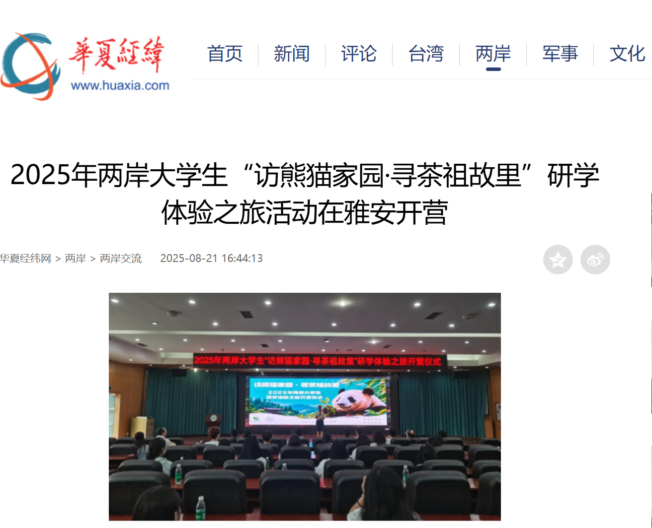 8月14日,2025年两岸大学生“访熊猫家园・寻茶祖故里”研学体验之旅开营仪式在四川省雅安市举行。雅安市委常委李蓉、四川农业大学党委副书记张强、台湾中华青年交流协会秘书长郑婷文以及来自台湾东华大学、世新大学及四川农业大学等16所高校的32名师生齐聚一堂,共同开启这场跨越海峡的文化探寻之旅。
