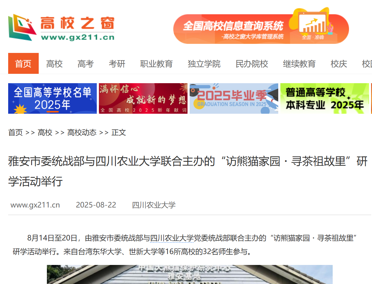 8月14日至20日,由雅安市委统战部与四川农业大学党委统战部联合主办的“访熊猫家园・寻茶祖故里”研学活动举行。来自台湾东华大学、世新大学等16所高校的32名师生参与。