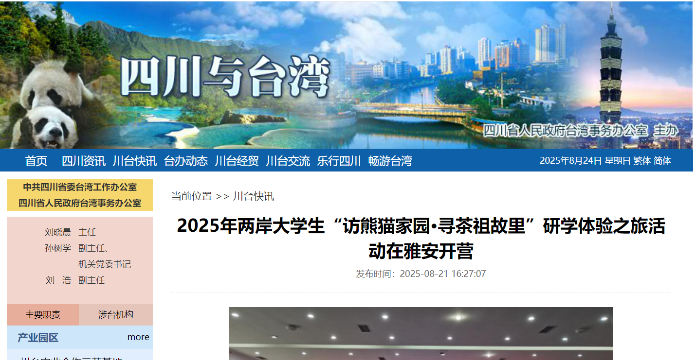 8月14日,2025年两岸大学生“访熊猫家园・寻茶祖故里”研学体验之旅开营仪式在四川省雅安市举行。雅安市委常委李蓉、四川农业大学党委副书记张强、台湾中华青年交流协会秘书长郑婷文以及来自台湾东华大学、世新大学及四川农业大学等16所高校的32名师生齐聚一堂,共同开启这场跨越海峡的文化探寻之旅。