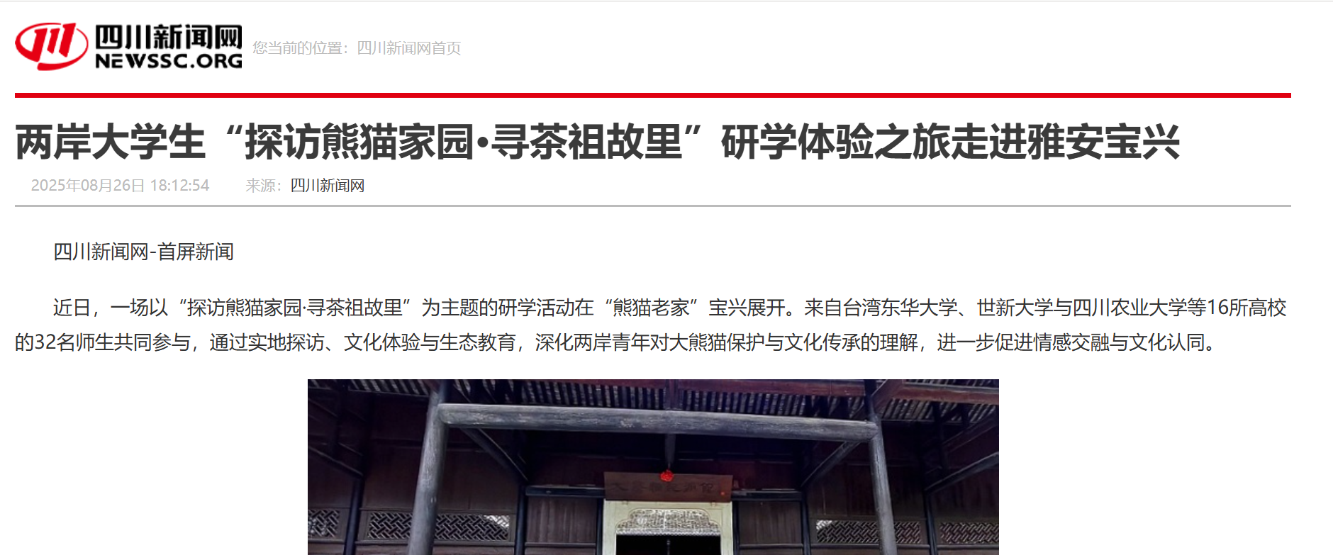 近日,一场以“探访熊猫家园·寻茶祖故里”为主题的研学活动在“熊猫老家”宝兴展开。来自台湾东华大学、世新大学与四川农业大学等16所高校的32名师生共同参与,通过实地探访、文化体验与生态教育,深化两岸青年对大熊猫保护与文化传承的理解,进一步促进情感交融与文化认同。