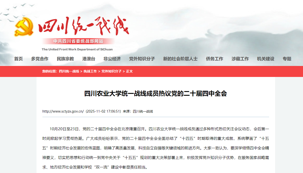 10月20日至23日,党的二十届四中全会在北京隆重召开。四川农业大学统一战线成员通过多种形式热切关注会议动态,会后第一时间掀起学习贯彻热潮。广大成员纷纷表示,党的二十届四中全会全面总结了“十四五”时期取得的重大成就,系统擘画了“十五五”时期经济社会发展的宏伟蓝图,明确了高质量发展、科技自立自强等关键领域的前进方向。大家一致认为,要深学细悟四中全会精神要义,切实把思想和行动统一到党中央关于“十五五”规划的重大决策部署上来,积极发挥党外知识分子优势,在服务国家战略需求、地方经济社会发展和学校“双一流”建设中彰显责任担当。